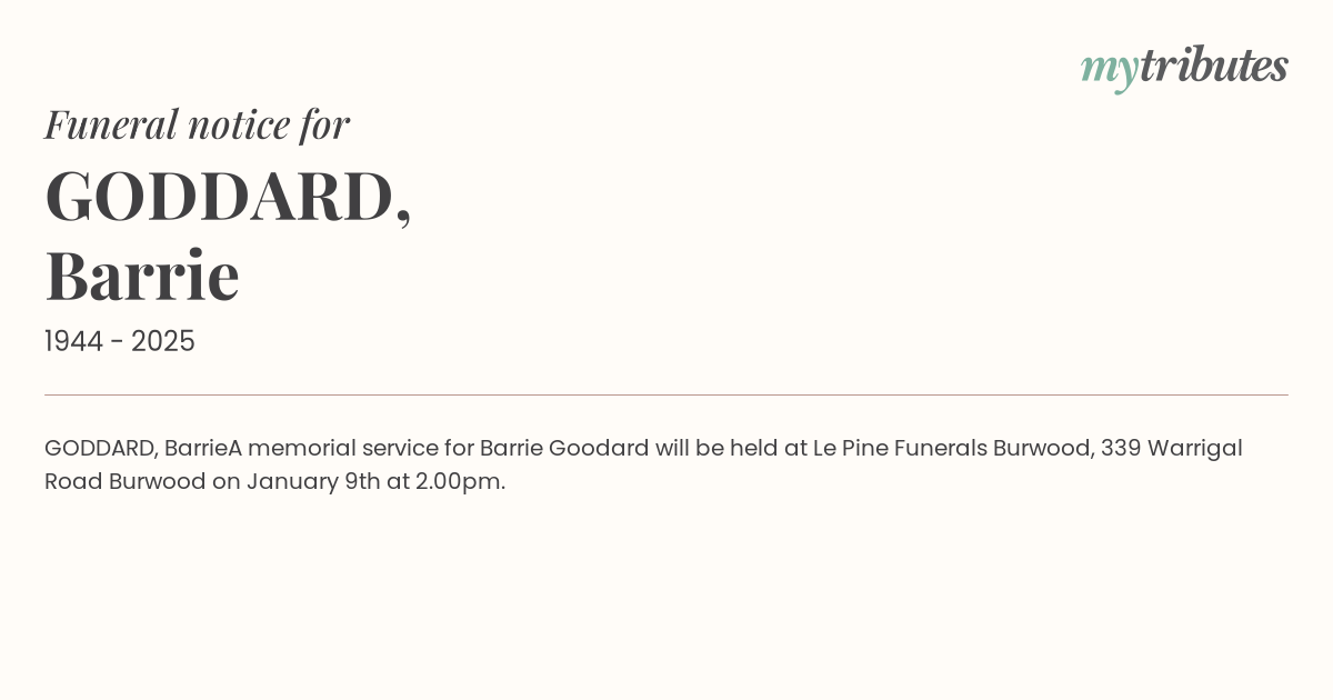 A memorial service for Barrie Goodard will be held at Le Pine Funerals Burwood, 339 Warrigal Road Burwood on January 9th at 2.00pm.