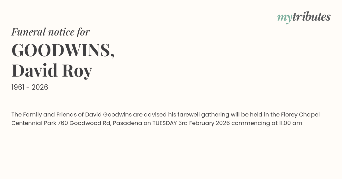 The Family and Friends of David Goodwins are advised his farewell gathering will be held in the Florey Chapel Centennial Park 760 Goodwood Rd, Pasadena on TUESDAY 3rd February 2026 commencing at 11.00 am