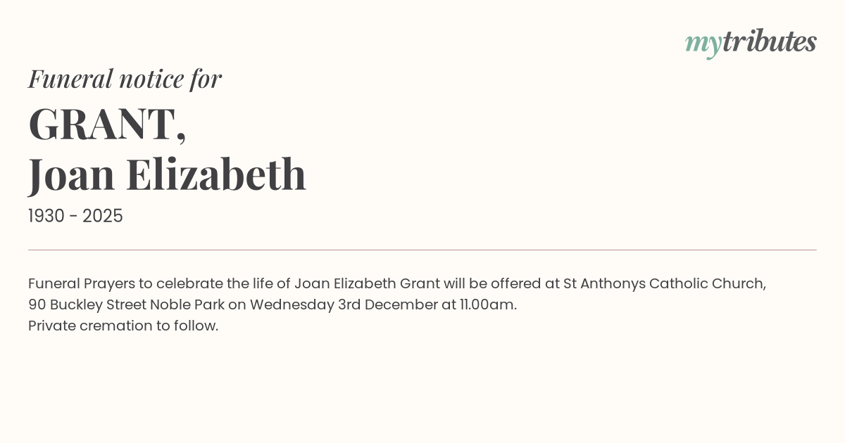 Funeral Prayers to celebrate the life of Joan Elizabeth Grant will be offered at St Anthony’s Catholic Church, 90 Buckley Street Noble Park on Wednesday 3rd December at 11.00am.