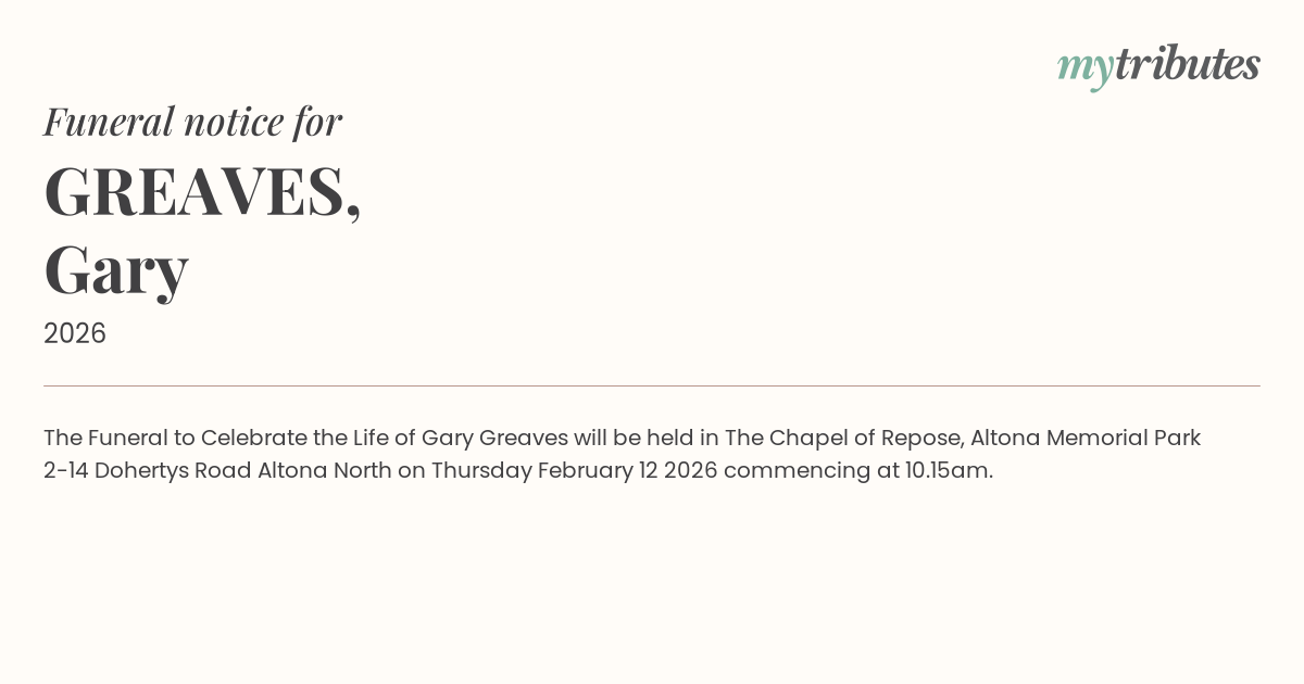 The Funeral to Celebrate the Life of Gary Greaves will be held in The Chapel of Repose, Altona Memorial Park 2-14 Doherty’s Road Altona North on Thursday February 12 2026 commencing at 10.15am.