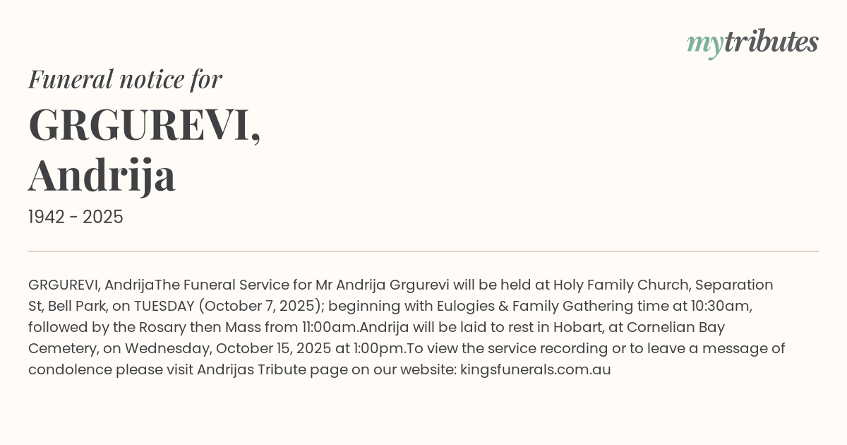 The Funeral Service for Mr Andrija Grgurević will be held at Holy Family Church, Separation St, Bell Park, on TUESDAY (October 7, 2025); beginning with Eulogies & Family Gathering time at 10:30am, followed by the Rosary then Mass from 11:00am.