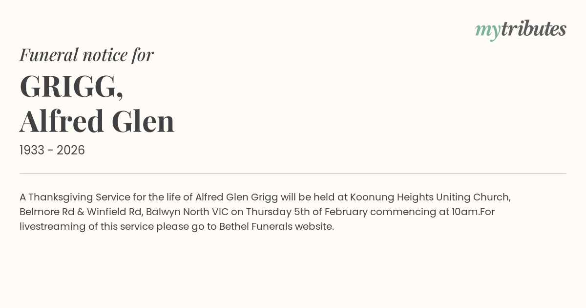A Thanksgiving Service for the life of Alfred Glen Grigg will be held at Koonung Heights Uniting Church, Belmore Rd & Winfield Rd, Balwyn North VIC on Thursday 5th of February commencing at 10am.