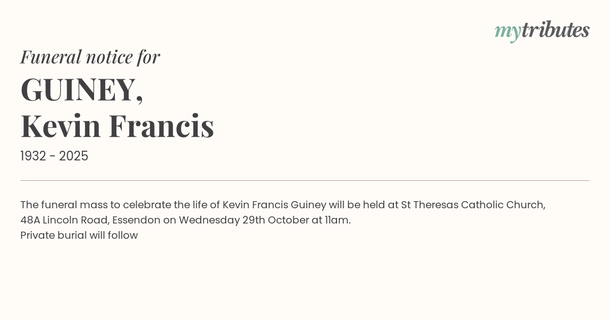 The funeral mass to celebrate the life of Kevin Francis Guiney will be held at St Theresa’s Catholic Church, 48A Lincoln Road, Essendon on Wednesday 29th October at 11am.