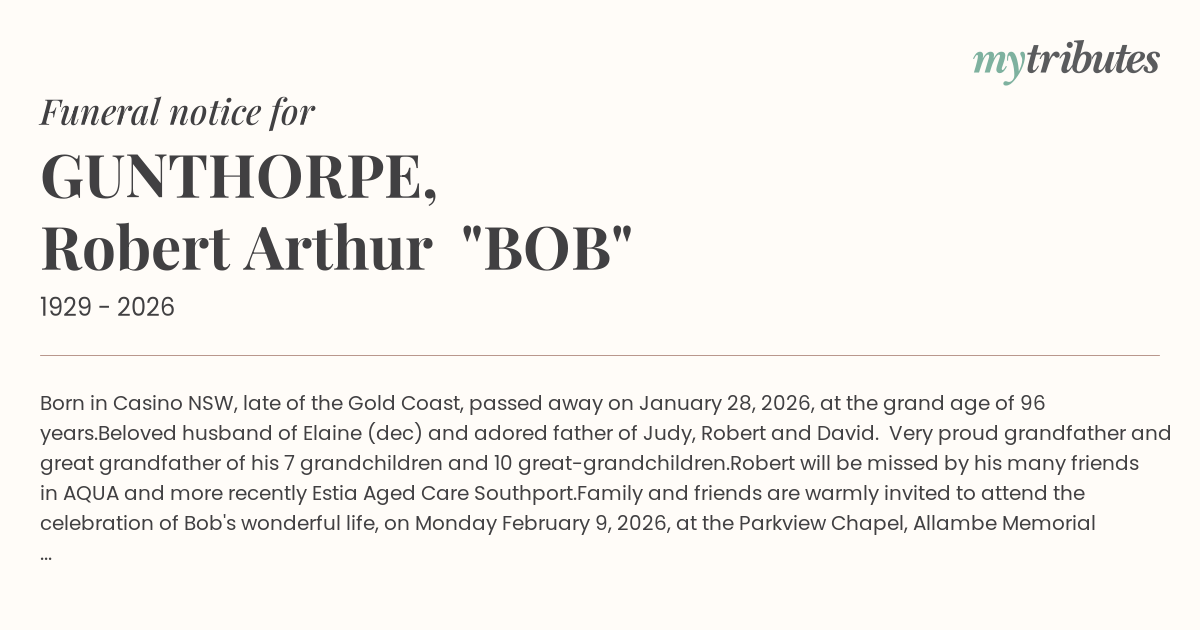 Family and friends are warmly invited to attend the celebration of Bob's wonderful life, on Monday February 9, 2026, at the Parkview Chapel, Allambe Memorial Park, Nerang-Broadbeach Road, Nerang, commencing at 11am.