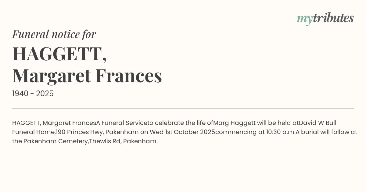 Marg Haggett will be held at