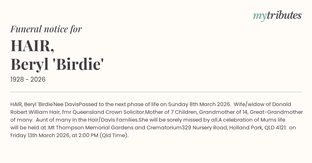 on Sunday 8th March 2026. Wife/widow of Donald Robert William Hair, fmr Queensland Crown Solicitor.