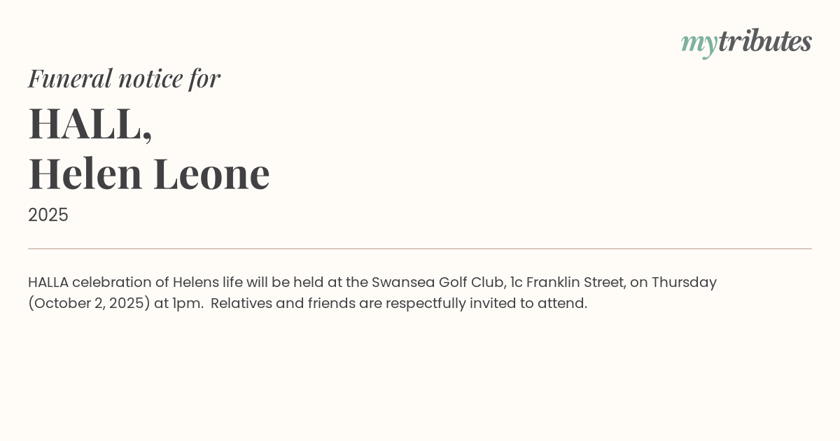 A celebration of Helen’s life will be held at the Swansea Golf Club, 1c Franklin Street, on Thursday (October 2, 2025) at 1pm. Relatives and friends are respectfully invited to attend.