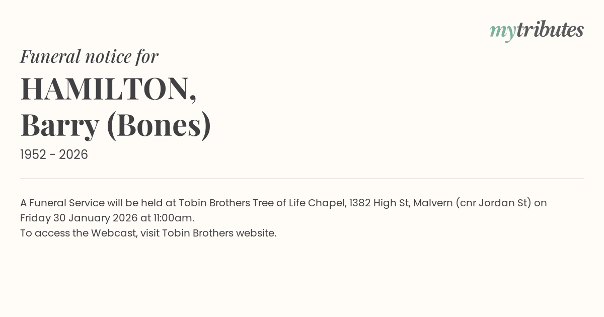 A Funeral Service will be held at Tobin Brothers Tree of Life Chapel, 1382 High St, Malvern (cnr Jordan St) on Friday 30 January 2026 at 11:00am.