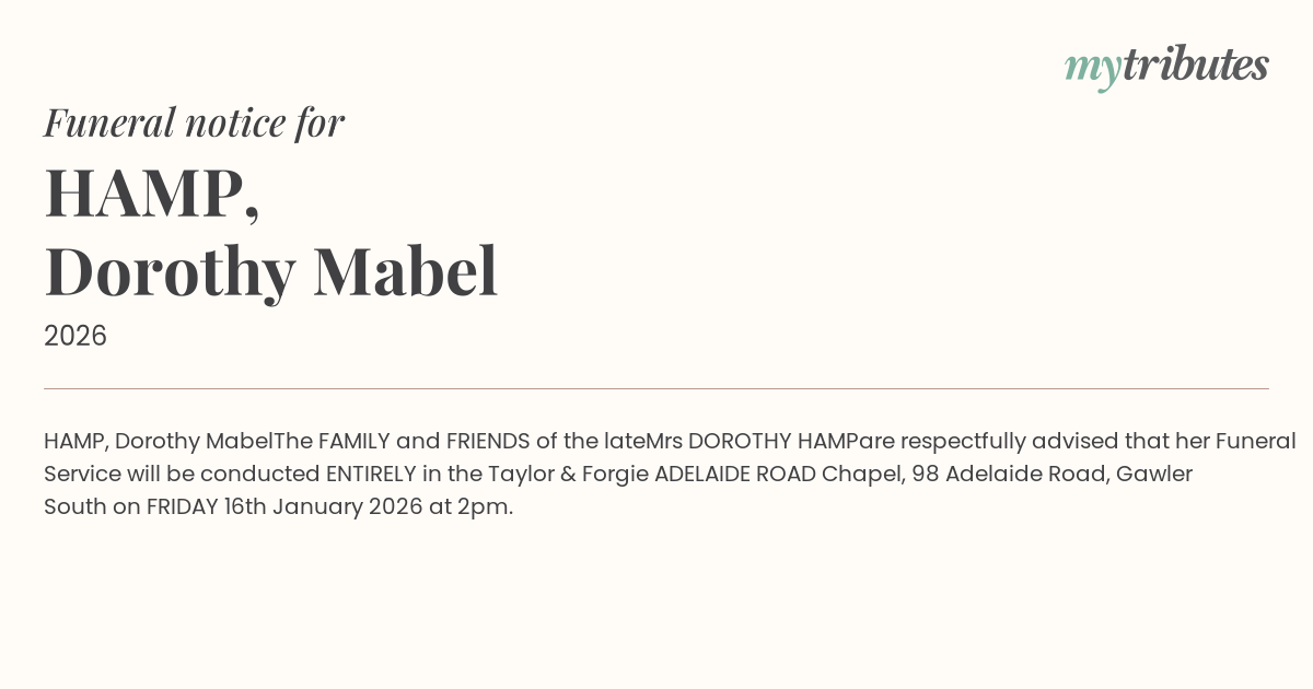 are respectfully advised that her Funeral Service will be conducted ENTIRELY in the Taylor & Forgie ADELAIDE ROAD Chapel, 98 Adelaide Road, Gawler South on FRIDAY 16th January 2026 at 2pm.