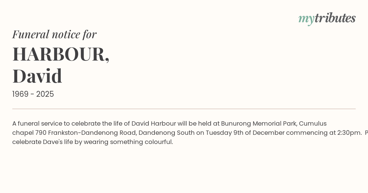 A funeral service to celebrate the life of David Harbour will be held at Bunurong Memorial Park, Cumulus chapel 790 Frankston-Dandenong Road, Dandenong South on Tuesday 9th of December commencing at 2:30pm. Please celebrate Dave's life by wearing something colourful.