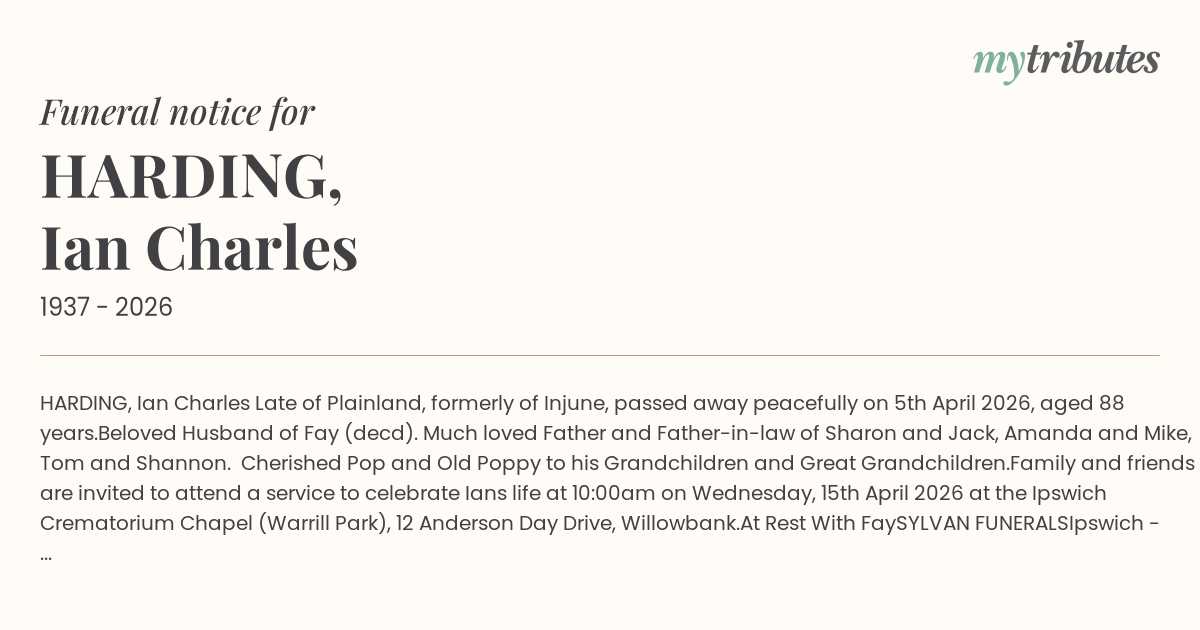 Family and friends are invited to attend a service to celebrate Ian’s life at 10:00am on Wednesday, 15th April 2026 at the Ipswich Crematorium Chapel (Warrill Park), 12 Anderson Day Drive, Willowbank.