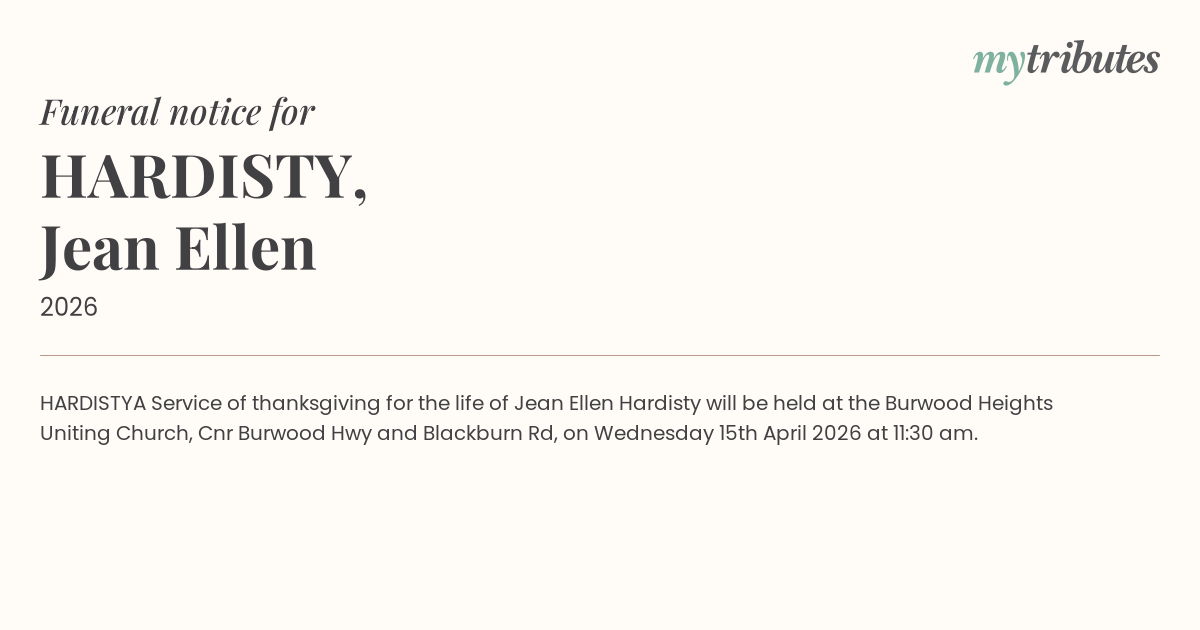 A Service of thanksgiving for the life of Jean Ellen Hardisty will be held at the Burwood Heights Uniting Church, Cnr Burwood Hwy and Blackburn Rd, on Wednesday 15th April 2026 at 11:30 am.