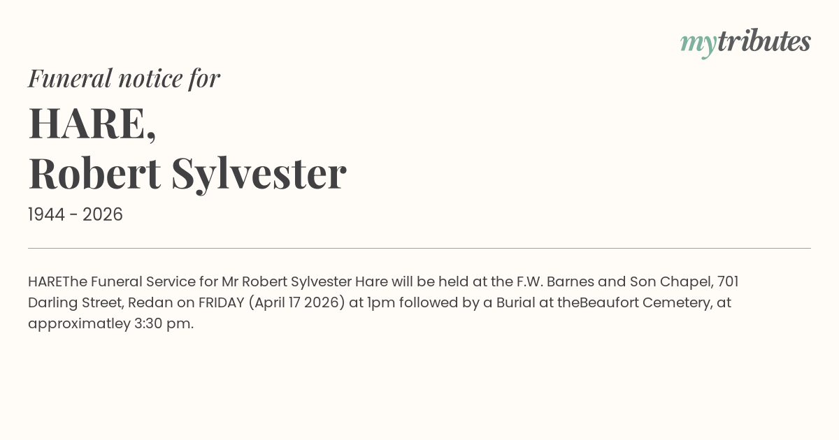 Mr Robert Sylvester Hare will be held at the F.W. Barnes and Son Chapel, 701 Darling Street, Redan on FRIDAY (April 17 2026) at 1pm followed by a Burial at the