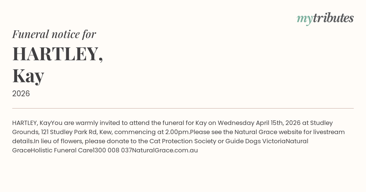 You are warmly invited to attend the funeral for Kay on Wednesday April 15th, 2026 at Studley Grounds, 121 Studley Park Rd, Kew, commencing at 2.00pm.