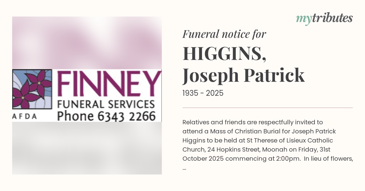Relatives and friends are respectfully invited to attend a Mass of Christian Burial for Joseph Patrick Higgins to be held at St Therese of Lisieux Catholic Church, 24 Hopkins Street, Moonah on Friday, 31st October 2025 commencing at 2:00pm. In lieu of flowers, donations to the St Vincent De Paul Society would be appreciated and may be made at the service. For those wishing to view the service on livesteam, please visit: https://www.finneyfunerals.com.au/funerals