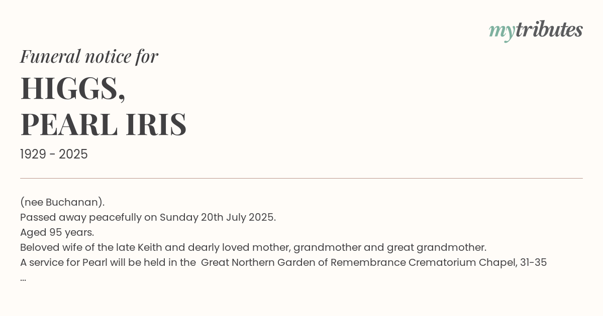 A service for Pearl will be held in the Great Northern Garden of Remembrance Crematorium Chapel, 31-35 Tallowwood Drive, Deception Bay on Thursday 31st July commencing at 10:00am