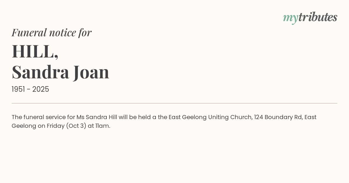 The funeral service for Ms Sandra Hill will be held a the East Geelong Uniting Church, 124 Boundary Rd, East Geelong on Friday (Oct 3) at 11am.