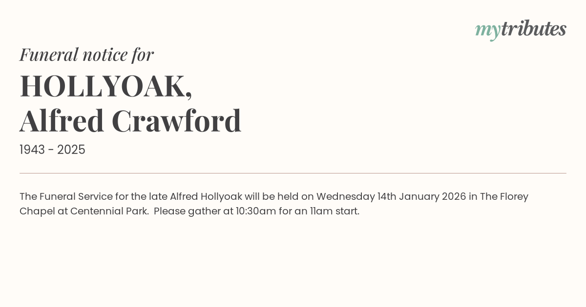 The Funeral Service for the late Alfred Hollyoak will be held on Wednesday 14th January 2026 in The Florey Chapel at Centennial Park. Please gather at 10:30am for an 11am start.
