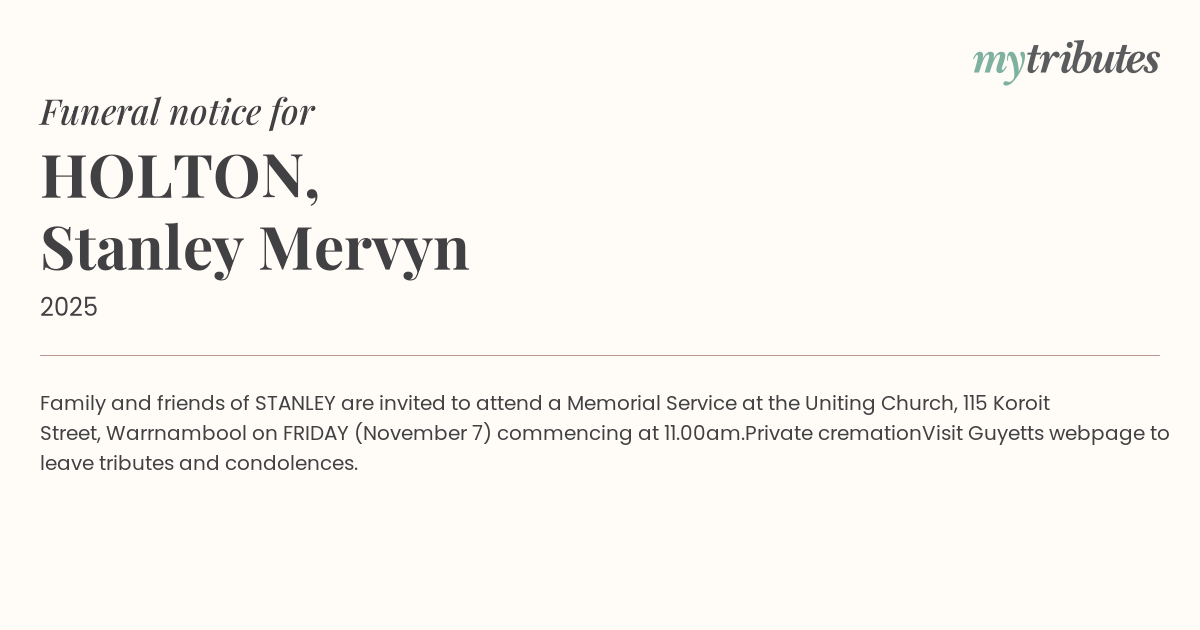 Family and friends of STANLEY are invited to attend a Memorial Service at the Uniting Church, 115 Koroit Street, Warrnambool on FRIDAY (November 7) commencing at 11.00am.