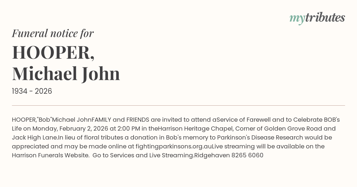 In lieu of floral tributes a donation in Bob's memory to Parkinson's Disease Research would be appreciated and may be made online at fightingparkinsons.org.au