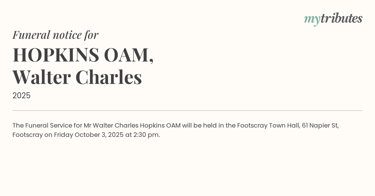 The Funeral Service for Mr Walter Charles Hopkins OAM will be held in the Footscray Town Hall, 61 Napier St, Footscray on Friday October 3, 2025 at 2:30 pm.