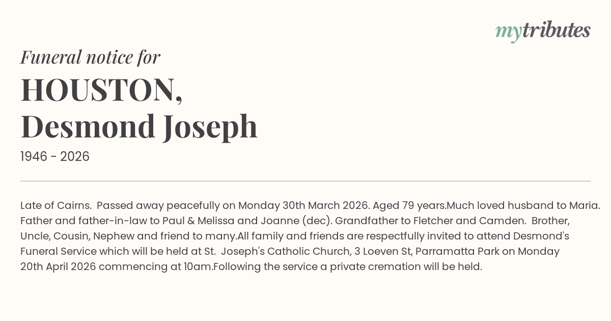 All family and friends are respectfully invited to attend Desmond's Funeral Service which will be held at St. Joseph's Catholic Church, 3 Loeven St, Parramatta Park on Monday 20th April 2026 commencing at 10am.