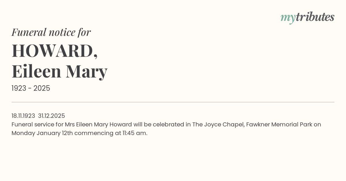 Funeral service for Mrs Eileen Mary Howard will be celebrated in The Joyce Chapel, Fawkner Memorial Park on Monday January 12th commencing at 11:45 am.