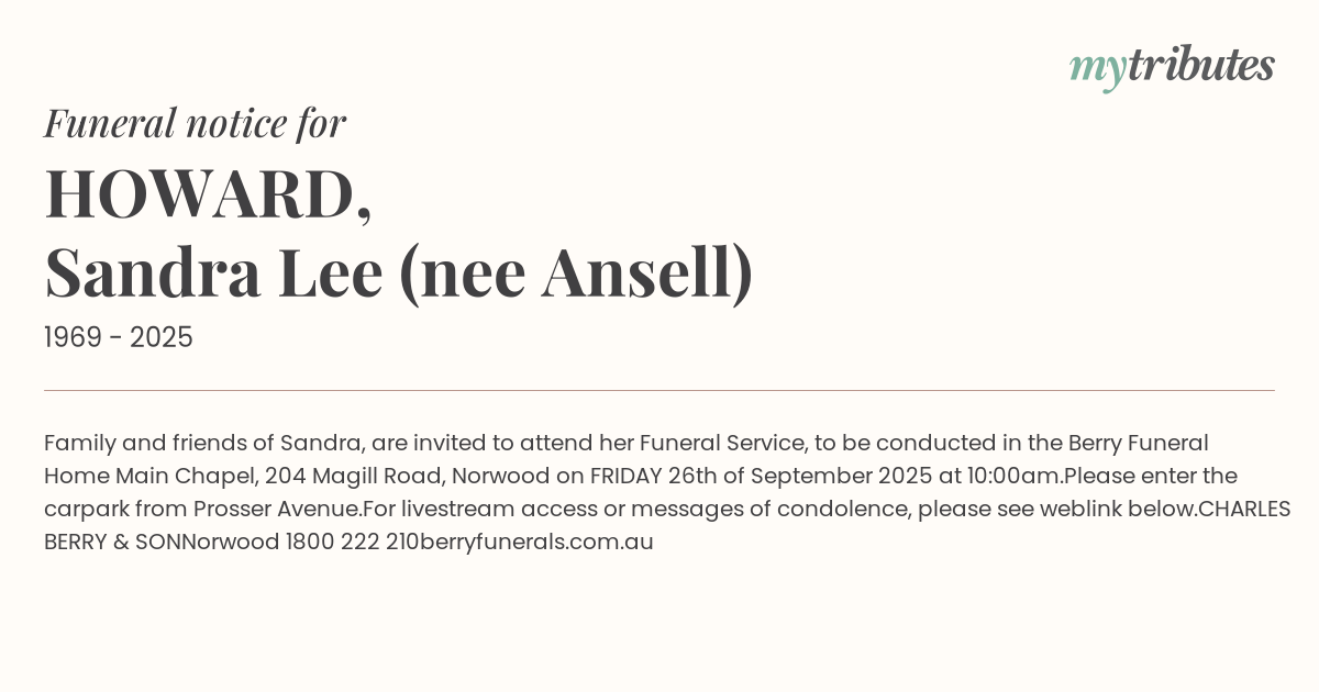Family and friends of Sandra, are invited to attend her Funeral Service, to be conducted in the Berry Funeral Home Main Chapel, 204 Magill Road, Norwood on FRIDAY 26th of September 2025 at 10:00am.