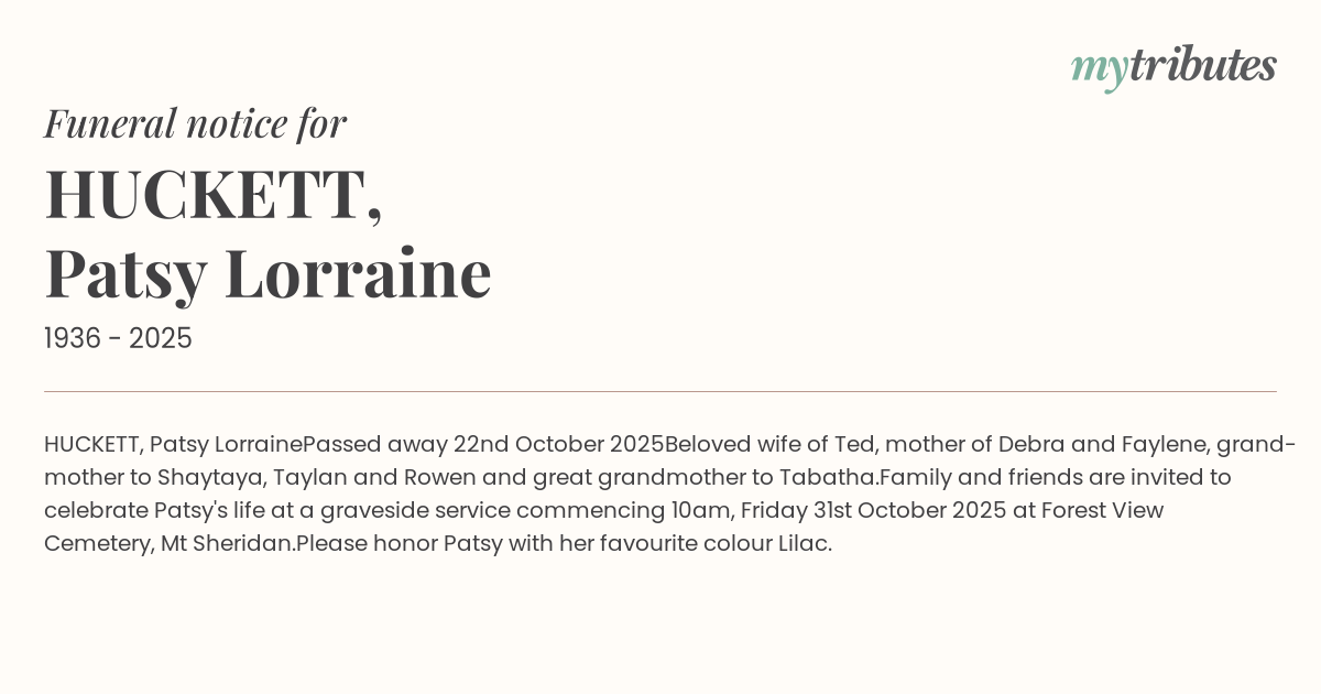 Family and friends are invited to celebrate Patsy's life at a graveside service commencing 10am, Friday 31st October 2025 at Forest View Cemetery, Mt Sheridan.
