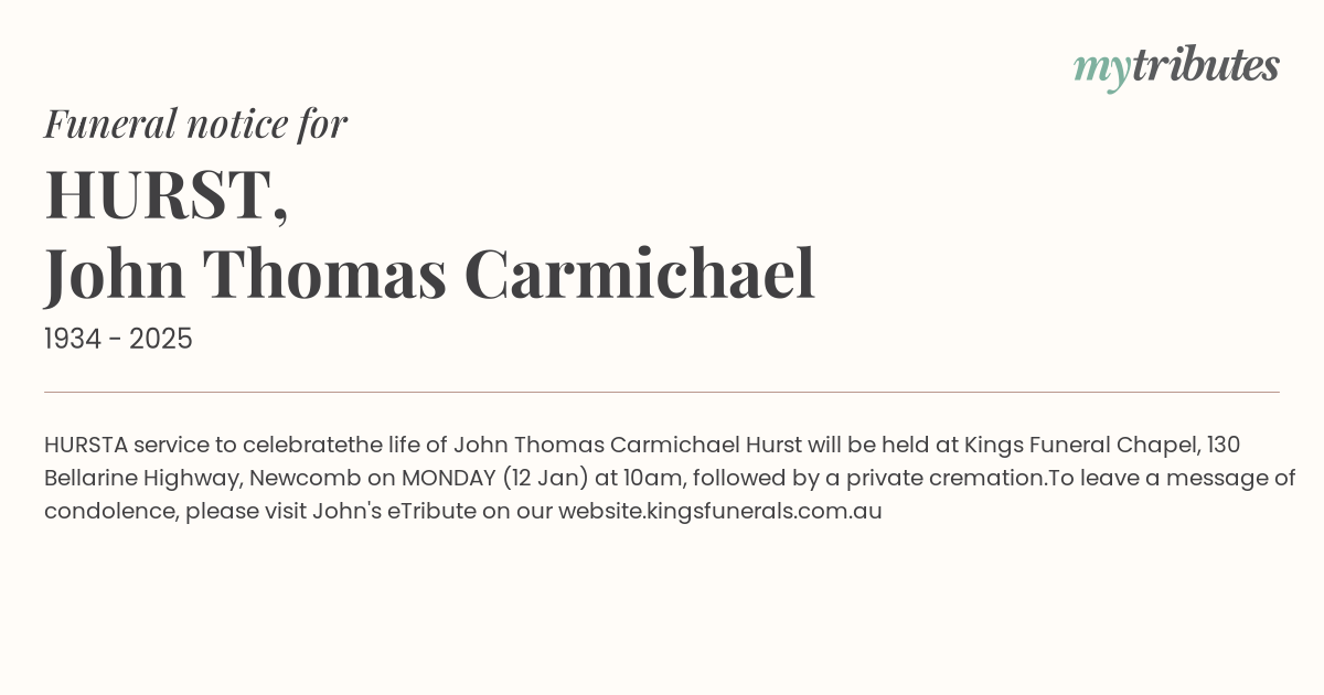 the life of John Thomas Carmichael Hurst will be held at Kings Funeral Chapel, 130 Bellarine Highway, Newcomb on MONDAY (12 Jan) at 10am, followed by a private cremation.