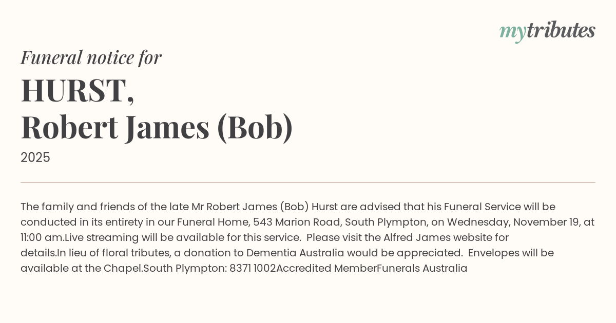 The family and friends of the late Mr Robert James (Bob) Hurst are advised that his Funeral Service will be conducted in its entirety in our Funeral Home, 543 Marion Road, South Plympton, on Wednesday, November 19, at 11:00 am.