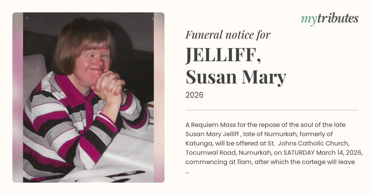 A Requiem Mass for the repose of the soul of the late Susan Mary Jelliff , late of Numurkah, formerly of Katunga, will be offered at St. John’s Catholic Church, Tocumwal Road, Numurkah, on SATURDAY March 14, 2026, commencing at 11am, after which the cortege will leave for the Numurkah General Cemetery.