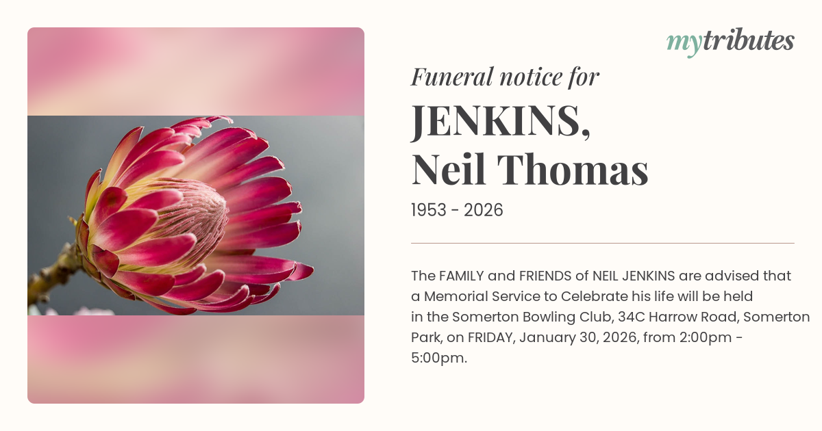 The FAMILY and FRIENDS of NEIL JENKINS are advised that a Memorial Service to Celebrate his life will be held in the Somerton Bowling Club, 34C Harrow Road, Somerton Park, on FRIDAY, January 30, 2026, from 2:00pm - 5:00pm.
