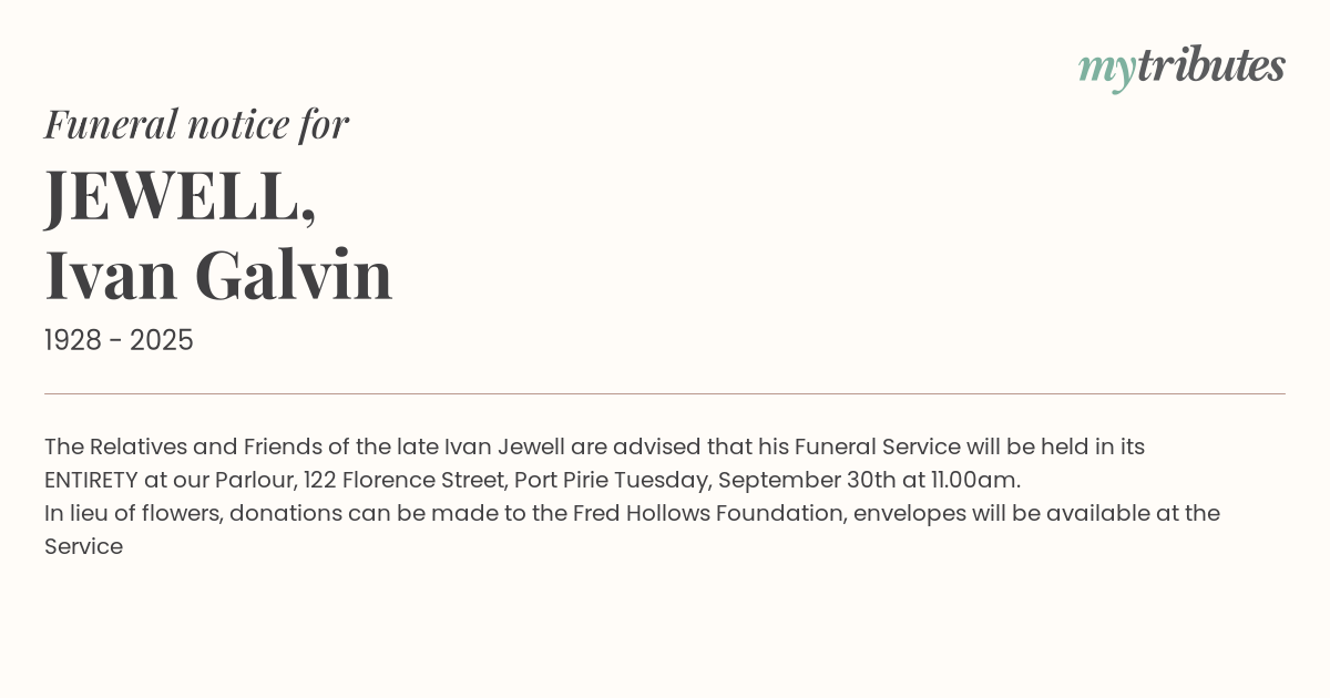 The Relatives and Friends of the late Ivan Jewell are advised that his Funeral Service will be held in its ENTIRETY at our Parlour, 122 Florence Street, Port Pirie Tuesday, September 30th at 11.00am.