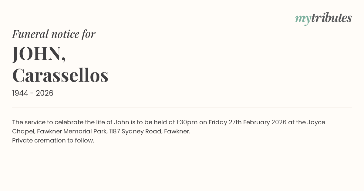 The service to celebrate the life of John is to be held at 1:30pm on Friday 27th February 2026 at the Joyce Chapel, Fawkner Memorial Park, 1187 Sydney Road, Fawkner.
