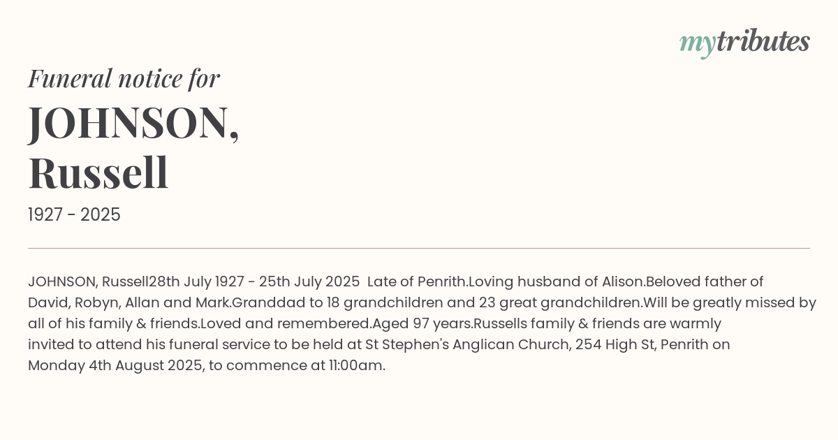 Russell’s family & friends are warmly invited to attend his funeral service to be held at St Stephen's Anglican Church, 254 High St, Penrith on Monday 4th August 2025, to commence at 11:00am.