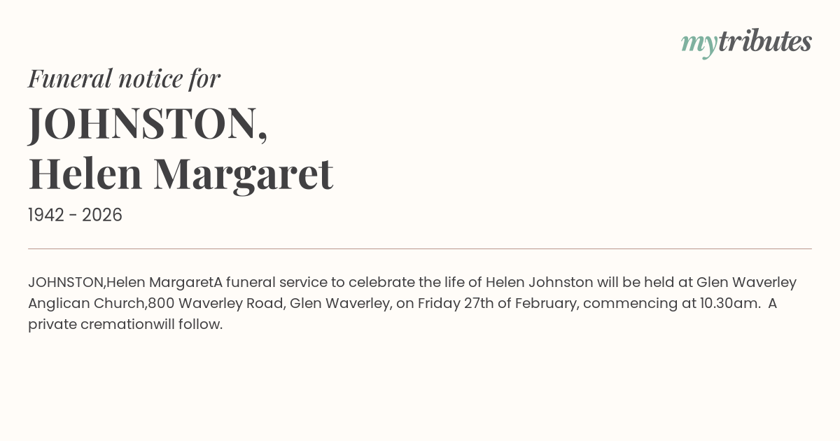 A funeral service to celebrate the life of Helen Johnston will be held at Glen Waverley Anglican Church,