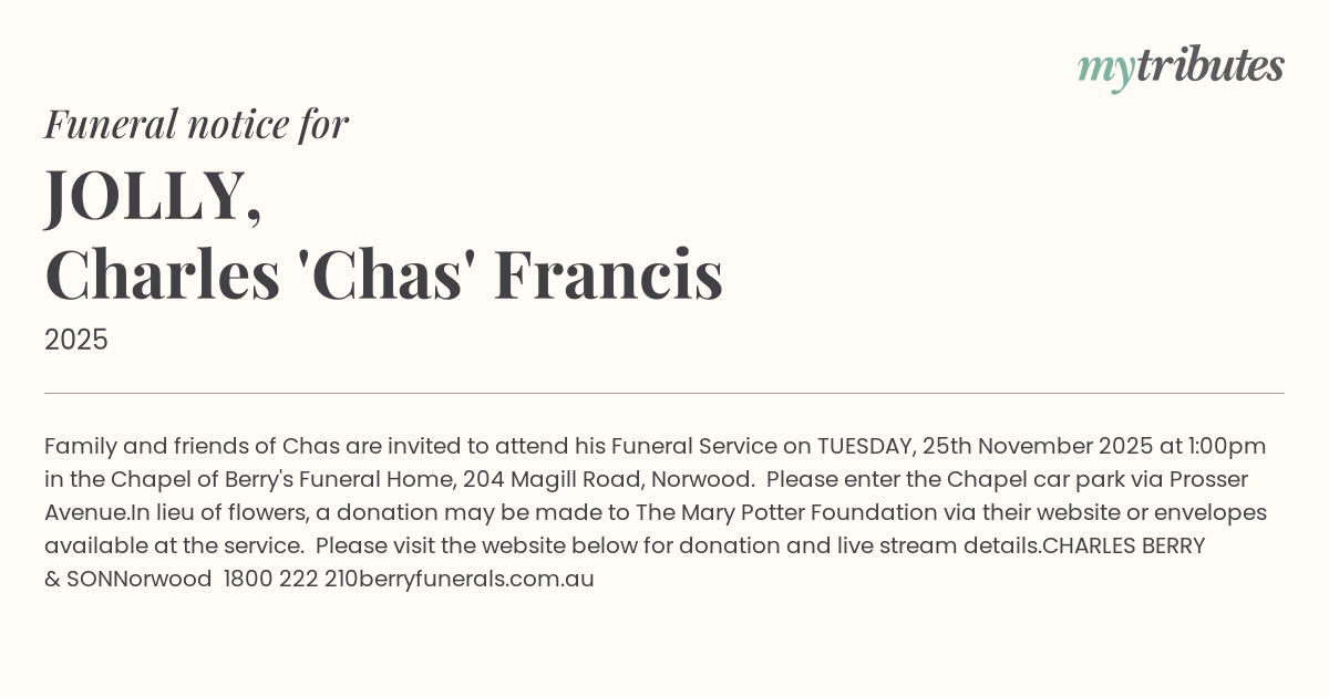 Family and friends of Chas are invited to attend his Funeral Service on TUESDAY, 25th November 2025 at 1:00pm in the Chapel of Berry's Funeral Home, 204 Magill Road, Norwood.