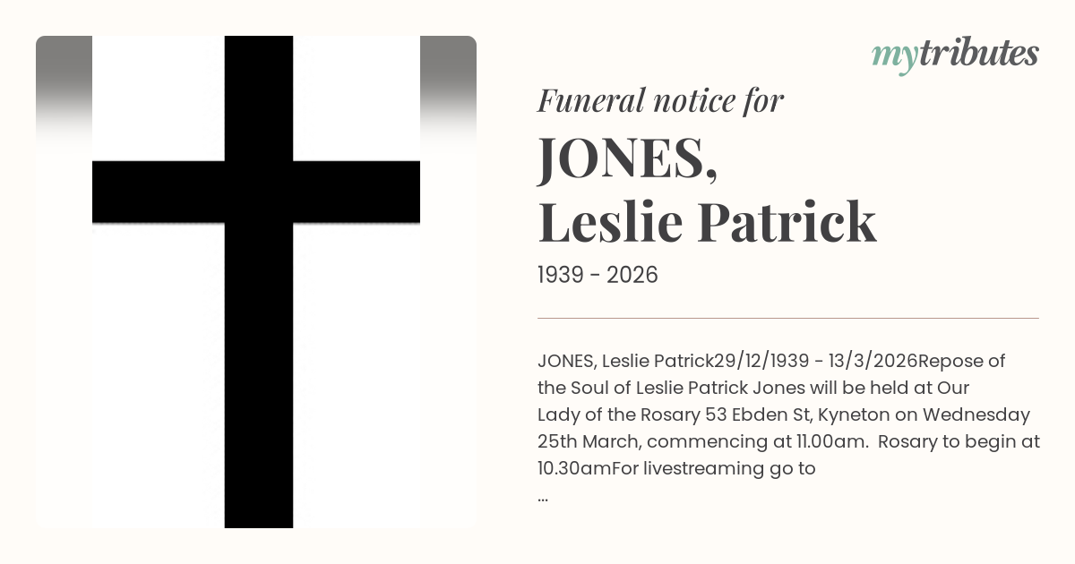 Repose of the Soul of Leslie Patrick Jones will be held at