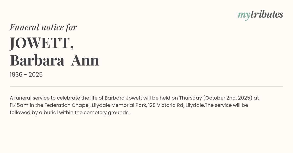 A funeral service to celebrate the life of Barbara Jowett will be held on Thursday (October 2nd, 2025) at 11.45am in the Federation Chapel, Lilydale Memorial Park, 128 Victoria Rd, Lilydale.