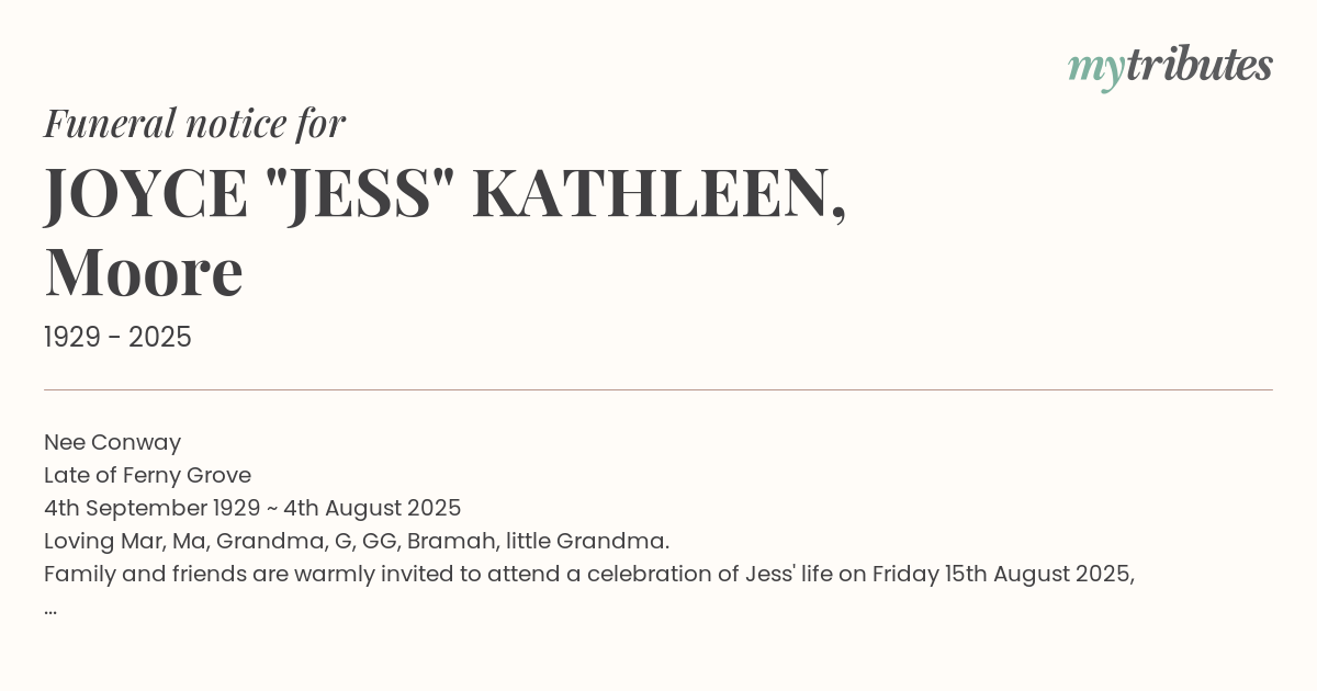 Nee Conway Late of Ferny Grove 4th September 1929 ~ 4th August 2025 Loving Mar, Ma, Grandma, G, GG, Bramah, little Grandma. Family and friends are warmly invited to attend a celebration of Jess' life on Friday 15th August 2025, commencing at 10:30am in the West Chapel, Mt. Thompson Memorial Gardens, Nursery Road, Holland Park West.