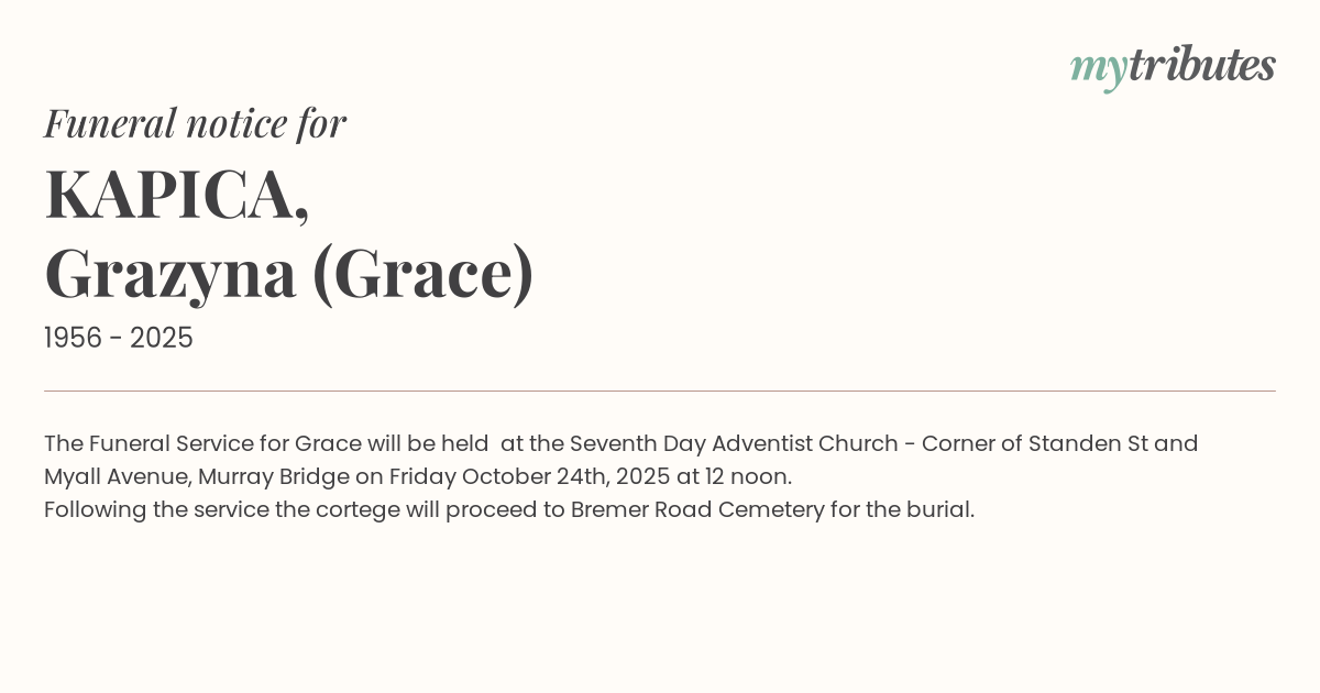 The Funeral Service for Grace will be held at the Seventh Day Adventist Church - Corner of Standen St and Myall Avenue, Murray Bridge on Friday October 24th, 2025 at 12 noon.