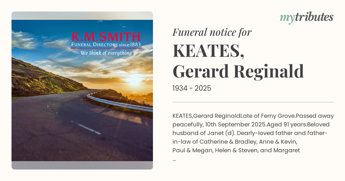 Relatives and friends are invited to attend Gerard's Funeral Mass held in Our Lady of Dolours Catholic Church, cnr Suez Street & Samford Road, Mitchelton on the 7th October 2025 commencing at 10a.m.