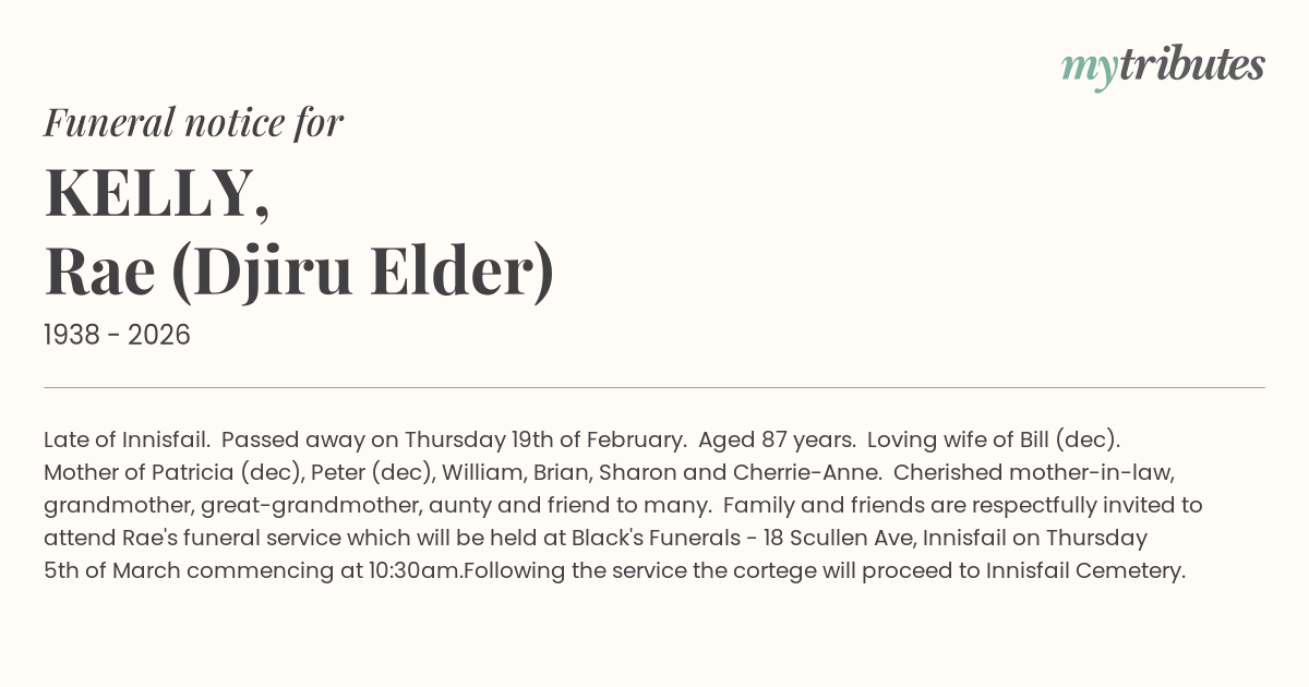 Family and friends are respectfully invited to attend Rae's funeral service which will be held at Black's Funerals - 18 Scullen Ave, Innisfail on Thursday 5th of March commencing at 10:30am.