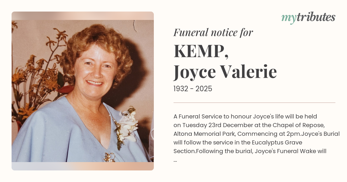 A Funeral Service to honour Joyce's life will be held on Tuesday 23rd December at the Chapel of Repose, Altona Memorial Park, Commencing at 2pm.