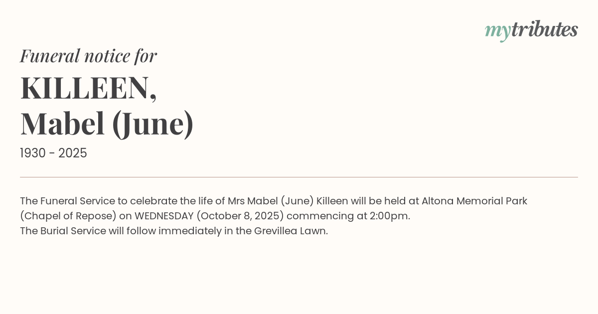 The Funeral Service to celebrate the life of Mrs Mabel (June) Killeen will be held at Altona Memorial Park (Chapel of Repose) on WEDNESDAY (October 8, 2025) commencing at 2:00pm.