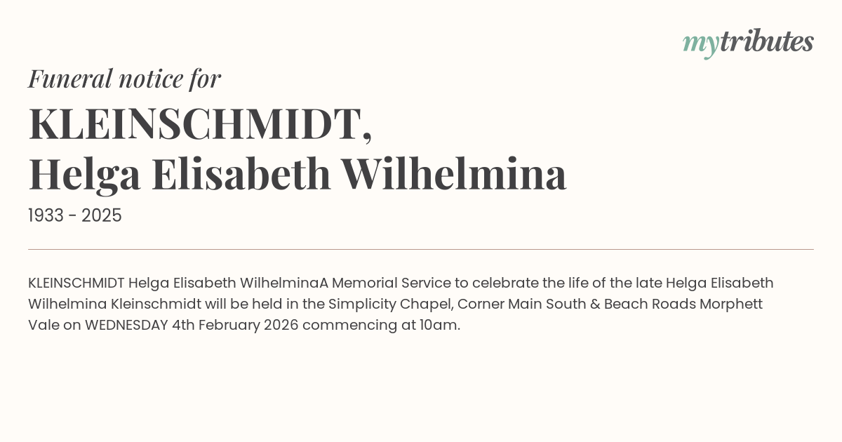 A Memorial Service to celebrate the life of the late Helga Elisabeth Wilhelmina Kleinschmidt will be held in the Simplicity Chapel, Corner Main South & Beach Roads Morphett Vale on WEDNESDAY 4th February 2026 commencing at 10am.