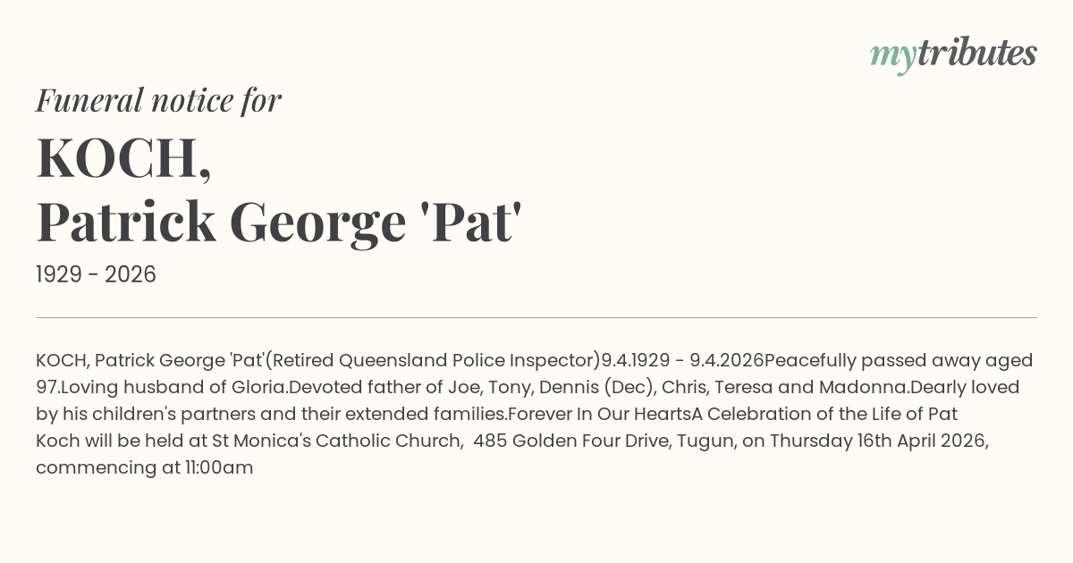 A Celebration of the Life of Pat Koch will be held at St Monica's Catholic Church, 485 Golden Four Drive, Tugun, on Thursday 16th April 2026, commencing at 11:00am