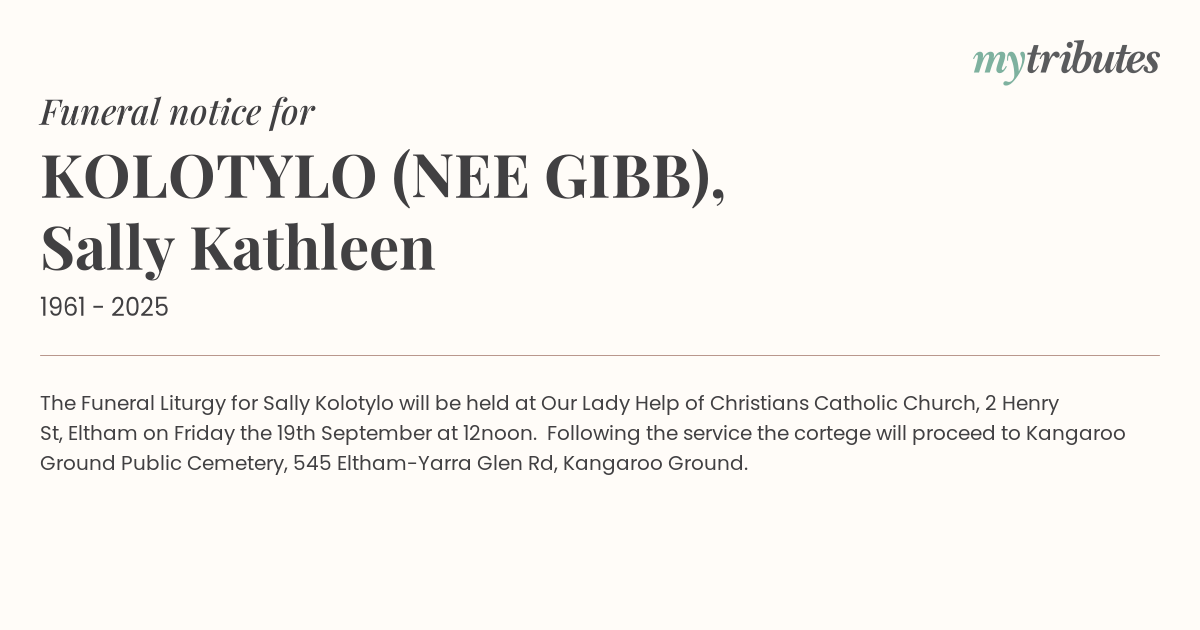 The Funeral Liturgy for Sally Kolotylo will be held at Our Lady Help of Christians Catholic Church, 2 Henry St, Eltham on Friday the 19th September at 12noon. Following the service the cortege will proceed to Kangaroo Ground Public Cemetery, 545 Eltham-Yarra Glen Rd, Kangaroo Ground.