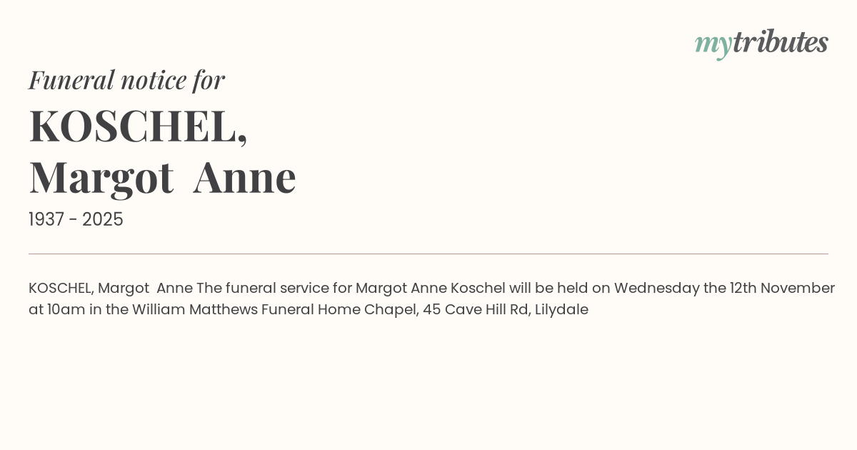 The funeral service for Margot Anne Koschel will be held on Wednesday the 12th November at 10am in the William Matthews Funeral Home Chapel, 45 Cave Hill Rd, Lilydale